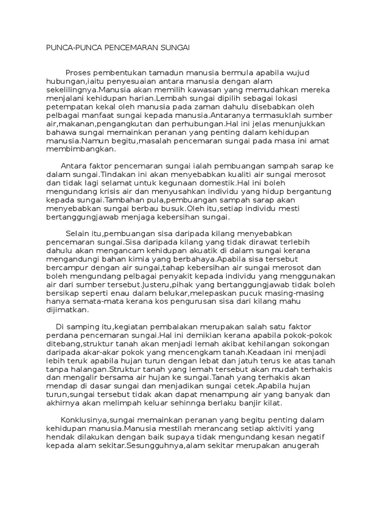 Kesan Pencemaran from imgv2-1-f.scribdassets.com Apabila sumber air tempat kehidupan akuatik tercemar, maka siklus makanan dalam air terganggu dan ekosistem air/kehidupan akuatik akan terganggu pula. Suhu air sangat berperan dalam proses reproduksi hewan air. Lagipun, hal ini memberi kesan negatif terhadap kesihatan, seperti kehadiran. Penyebab pencemaran air sering diakibatkan sampah dan limbah hasil kegiatan manusia. Laluan utama pencemaran dari darat ke lautan adalah melalui sungai. Kesannya ialah manusia akan dijangkiti pelbagai penyakit. Pencemaran air boleh mencetuskan tanah runtuh, hakisan dan banjir. Dampak polusi air tersebut meliputi beberapa hal seperti dampak terhadap industri, dampak setelah mengetahui dampak polusi atau pencemaran air, kita pasti akan bertanya semoga bisa menjadi pembelajaran bagi kita dan menyadarkan kita akan arti penting serta peran air bagi kehidupan kita.